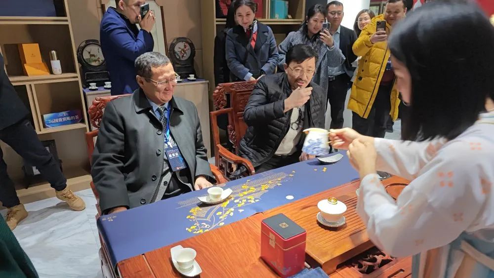 《Bawrsak(包尔萨克)剧场》开播仪式当天,外宾在中哈霍尔果斯国际边境合作中心中国文化馆里体验中国文化。(新华社记者 马嘉帅 摄)