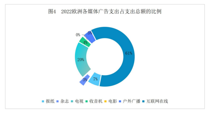 与2021年相比,2022年欧洲的电视广告收入下降了3.8%,为288亿欧元;报纸和杂志广告收入下降了2.4%,为143亿欧元。