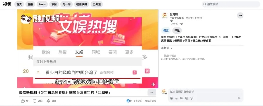 8月5日,中国台湾网《两岸头条》栏目发布报道《国风新武侠热播剧<少年白马醉春风>获台湾青年追捧》,介绍《少年白马醉春风》在两岸青年中引发强劲的观剧热潮,微博话题#看少白的风吹到中国台湾了#冲上热搜榜单第20位,并表示“一些台湾青年在观剧后表示,通过这部作品更加深刻地了解到中华传统文化的独特魅力和价值所在。《少年白马醉春风》在两岸的热播,不仅点燃了台湾青年热血沸腾的‘江湖梦’,更让他们感受到两岸文化‘同根同源、血脉相连’的情感纽带。”