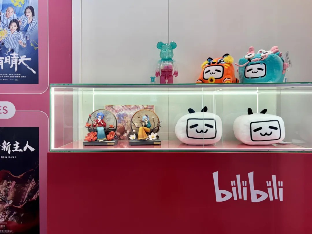 此外,B站还展出了一系列融入中国传统元素的文创产品,如中国传统“十二生肖”文化特色的龙年小电视玩偶、B站2233娘“国风华彩”故宫系列手办、世界首位中文虚拟歌手洛天依“游学记”非遗系列盲盒等。这些产品在满足用户文化消费需求的同时,也反映了具有代表性的中国互联网企业,结合中国文化符号与自身优势,在视频化趋势下的多元商业化营收模式探索。展区的品牌IP区,则通过文字介绍和电视滚屏播放,直观地向海外受众介绍B站的品牌和其出品的各类题材丰富的精彩视听内容。