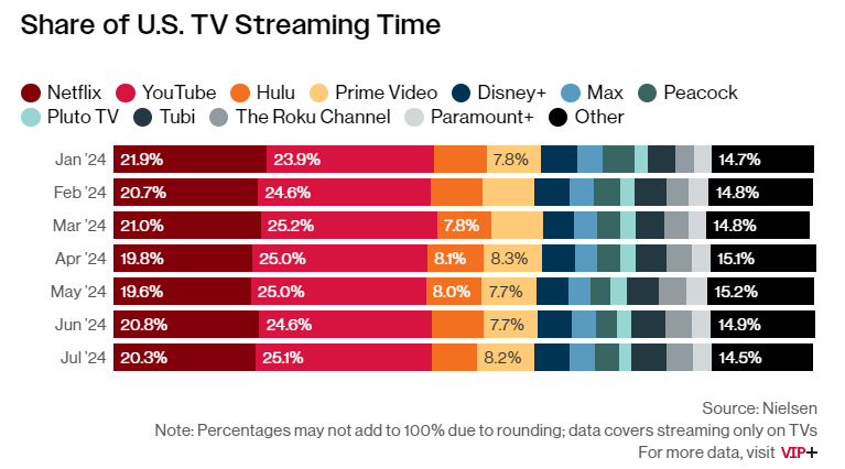 例如,如果把流媒体大战看作一场观看时间之战,那么真正的胜利者将不是奈飞,而是优兔(YouTube),根据尼尔森的月度报告《The Gauge》,优兔在美国电视和智能手机上的流媒体观看时间中占据主导地位。