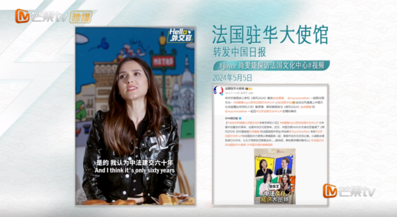 法国知名香颂歌手Joyce对节目的参与也引发了大众关注。法国总理加布里埃尔·阿塔尔(Gabriel Attal)为Joyce送上视频祝福,表示中法间的友谊通过她参与《乘风2024》体现了出来,相关内容获中国驻法使馆、法国驻华使馆等海内外机构连续10余次推荐。