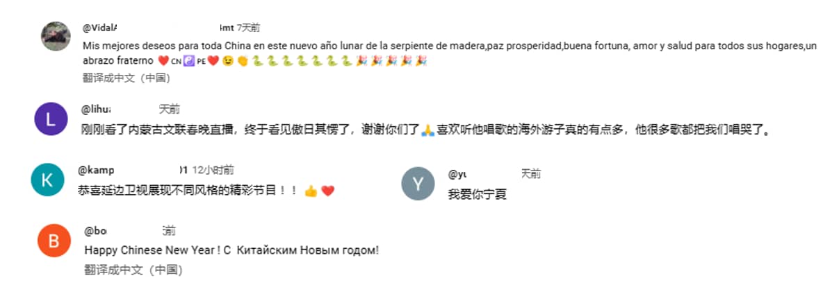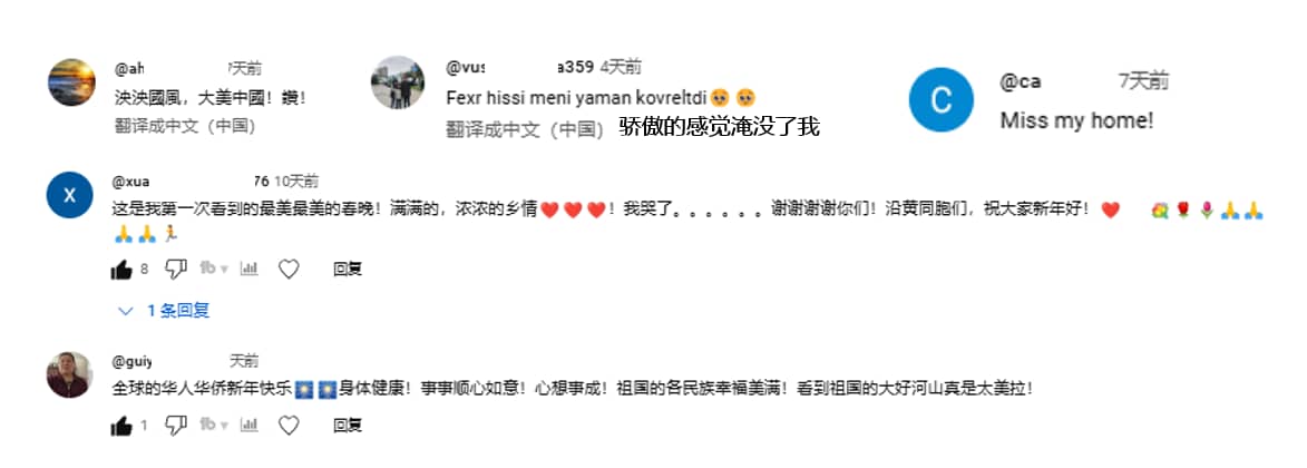 在评论区,来自世界各地的观众纷纷留言,不仅表达新年祝福,也传递着对中华文化的热爱与共鸣——“骄傲的感觉淹没了我!”、“泱泱国风,大美中国!”、“Miss my home”……无论是身在异国的华人,还是被中国文化吸引的海外观众,大家都在这场文化盛宴中找到共鸣,让春节成为全球共同的节日。