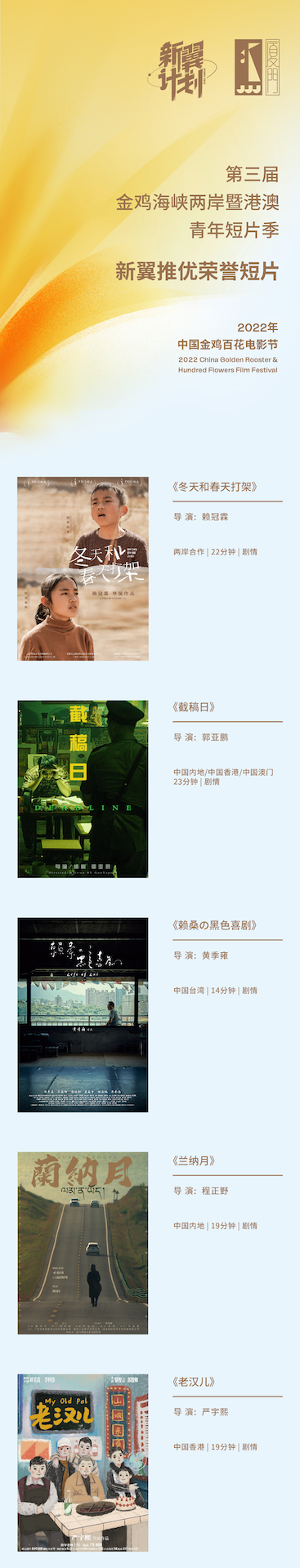 历时五个月,历经短片征集、初评、复评以及终评等环节的层层筛选后,最终,十部优秀短片突出重围,入选第三届金鸡海峡两岸暨港澳青年短片季·新翼推优荣誉短片。